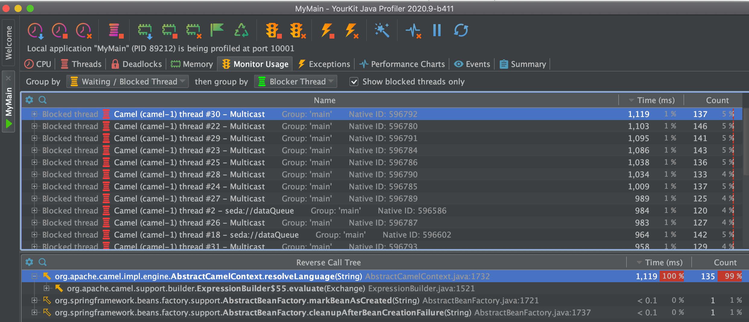 Another related problem is that in Camel 3 due to the modularization then some of the languages (bean, simple, and others) have been changed from being a singleton to prototype scoped. This is one of the biggest problems and we had a Camel user report a problem with thread contention in a high concurrent use-case would race for resolving languages (they are prototype scoped). So you would have this problem, and because the language resolver would query the registry first then Spring would throw NoSuchBeanDefinitionException, and then Camel would resolve the language via its own classpath resolver. So all together this cost performance. We can see this in the screenshots from the profiler in the following.